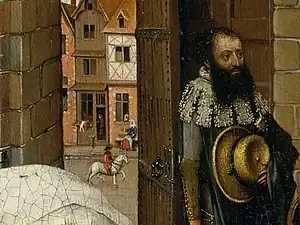 The attendant dressed in a festive outfit[20] is by a later artist, perhaps it was added after the donor's marriage.[21] The left hand space contains an unlocked entrance leading to a minutely detailed street scene.[15] The panel is the more striking as the door leading into the Virgin's chamber is wide open, hugely presumptuous for even a mid-fifteenth century commission, and suggesting access to the gates of heaven.[22]