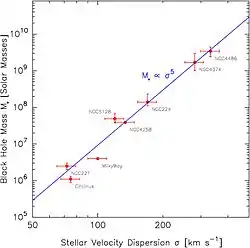 where is the solar mass. Publication of the relation in a refereed journal, by two groups, took place the following year.[2] [3] One of many recent studies,[4][5] based on the growing sample of published black hole masses in nearby galaxies, gives[6]
