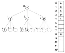 m-ary trees can also be stored in breadth-first order as an implicit data structure in arrays, and if the tree is a complete m-ary tree, this method wastes no space. In this compact arrangement, if a node has an index i, its c-th child in range {1,…,m} is found at index , while its parent (if any) is found at index (assuming the root has index zero, meaning a 0-based array). This method benefits from more compact storage and better locality of reference, particularly during a preorder traversal. The space complexity of this method is .