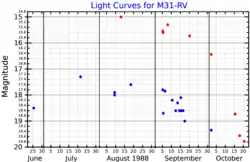 ![]() Light curves for M31-RV, adapted from Boschi and Munari (2004).[1] The red dots show the red band magnitude, and the blue dots show the blue band magnitude. | |