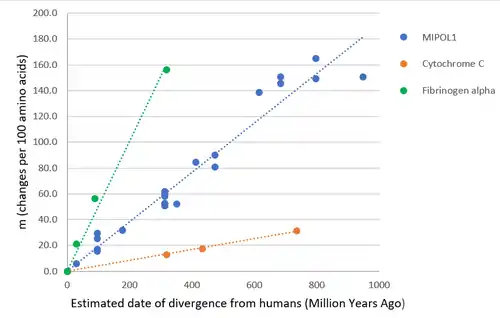 Using a linear regression analysis on a plot of corrected percent divergence (amino acid changes per 100 amino acids) as a function of date of divergence from humans for different MIPOL1 orthologs (see Fig.5), it is estimated that a 1% change in amino acids in the MIPOL1 protein takes 5.68 million years. MIPOL1 protein is evolving at a moderate rate relative to fast evolving protein such as fibrinogen alpha, and slow evolving proteins such as cytochrome C.