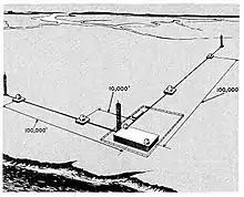 MISTRAM is a sophisticated interferometer system consisting of a group of five receiving stations arranged in an L shape. Baselines are 10,000 ft (3,000 m). and 100,000 ft (30,000 m). The central stations contains a simple tracking antenna. The distance from the central station to the furthest remote station is approximately 100,000 ft (30,000 m). Antennas at the central station and the four remote stations follow the flight of a missile and receive signals from its radio beacon.