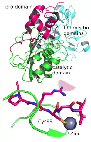 Activation is achieved through an interacting protease cascade involving plasmin and stromelysin 1 (MMP-3). Plasmin generates active MMP-3 from its zymogen. Active MMP-3 cleaves the propeptide from the 92-kDa pro-MMP-9, yielding an 82-kDa enzymatically active enzyme.[21] In the active enzyme a substrate, or a fluorogenic activity probe.,[20] replaces the propeptide in the enzyme active site where it is cleaved. The catalytic domain contains two zinc and three calcium atoms. The catalytic zinc is coordinated by three histidines from the conserved HEXXHXXGXXH binding motif. The other zinc atom and the three calcium atoms are structural. A conserved methionine, which forms a unique “Met-turn” structure categorizes MMP9 as a metzincin.[22] Three type II fibronectin repeats are inserted in the catalytic domain, although these domains are omitted in most crystallographic structures of MMP9 in complex with inhibitors. The active form of MMP9 also contains a C-terminal hemopexin-like domain. This domain is ellipsoidal in shape, formed by four β-propeller blades and an α-helix. Each blade consists of four antiparallel β-strands arranged around a funnel-like tunnel that contains two calcium and two chloride ions.[23] The hemopexin domain is important to facilitate the cleavage of triple helical interstitial collagens. .