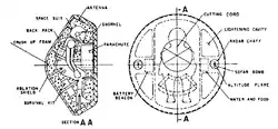 MOOSE, originally an acronym for Man Out Of Space Easiest but later changed to the more professional-sounding Manned Orbital Operations Safety Equipment,[1] was a proposed emergency "bail-out" system capable of bringing a single astronaut safely down from Earth orbit to the planet's surface.[2][3] The design was proposed by General Electric in the early 1960s. The system was quite compact, weighing 200 lb (91 kg) and fitting inside a suitcase-sized container. It consisted of a small twin-nozzle rocket motor sufficient to deorbit the astronaut, a PET film bag 6 ft (1.8 m) long with a flexible 0.25 in (6.4 mm) ablative heat shield on the back, two pressurized canisters to fill it with polyurethane foam, a parachute, radio equipment and a survival kit.[4]