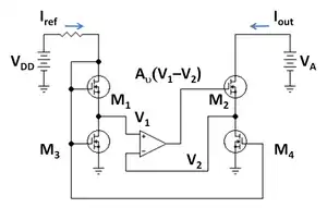 For analog operation, good gain requires a high MOSFET output impedance, which is to say, the MOSFET current should vary only slightly with the applied drain-to-source voltage. As devices are made smaller, the influence of the drain competes more successfully with that of the gate due to the growing proximity of these two electrodes, increasing the sensitivity of the MOSFET current to the drain voltage. To counteract the resulting decrease in output resistance, circuits are made more complex, either by requiring more devices, for example the cascode and cascade amplifiers, or by feedback circuitry using operational amplifiers, for example a circuit like that in the adjacent figure.