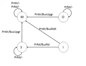 Once the block is in the Owned (O) state, then a processor read (PrRd) does not generate any snooped signal and the block remains in the same state. Whereas, a write request from the processor (PrWr) results in changing the state of the block from owned (O) to modified (M) along with generating a snooped write request (BusUpgr).[3]