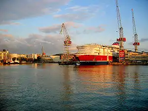 Viking XPRS was built at Aker Finnyards' Helsinki New Shipyard. The original delivery date of the ship was set for January 2008,[17] but due to numerous delays the delivery of the ship was pushed back until 28 April 2008. Reasons for the delays included slower-than-planned furnishing works and faults in one of the Rolls-Royce-manufactured propellers. Due to the propeller fault the ship sailed for dry docking at Aker Finnyards' Rauma shipyard on 8 April 2008 where the propeller was changed.[18] The ship was eventually delivered to Viking Line on 21 April 2008.[1]