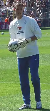 After Van der Sar's retirement from the national team, Stekelenburg became the Netherlands' first-choice goalkeeper under manager Bert van Marwijk. Stekelenburg was included in the preliminary squad for the 2010 FIFA World Cup in South Africa.[30] On 27 May 2010, Van Marwijk announced he would be part of the final 23-man squad participating in the competition.[31] Stekelenburg helped the Netherlands reach the final of the competition against Spain by making key saves throughout the tournament, most notably from Kaká in the Netherlands' 2–1 victory against Brazil in the quarter-finals.[32] He conceded six goals in the whole tournament, two of them being penalty kicks. Despite making a number of saves in the final, he ended up on the losing side, conceding the match's only goal to Andrés Iniesta in the 116th minute.
