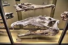 Machaeroprosopus (from Greek: μαχαίρα machaíra, 'large knife' and Greek: πρόσωπος prósōpos, 'bordering on')[6] is an extinct genus of mystriosuchin leptosuchomorph phytosaur from the Late Triassic of the southwestern United States. M. validus, once thought to be the type species of Machaeroprosopus, was named in 1916 on the basis of three complete skulls from Chinle Formation, Arizona. The skulls have been lost since the 1950s, and a line drawing in the original 1916 description is the only visual record of the specimen.[7] Another species, M. andersoni, was named in 1922 from New Mexico, and the species M. adamanensis, M. gregorii, M. lithodendrorum, M. tenuis, and M. zunii were named in 1930. Most species have been reassigned to the genera Smilosuchus,[8] Rutiodon, or Phytosaurus.[9] Until recently, M. validus was considered to be the only species that has not been reassigned. Thus, Machaeroprosopus was considered to be a nomen dubium or "doubtful name" because of the lack of diagnostic specimens that can support its distinction from other phytosaur genera. However, a taxonomic revision of Machaeroprosopus, conducted by Parker et al. in 2013, revealed that UW 3807, the holotype of M. validus, is not the holotype of Machaeroprosopus, while the species Machaeroprosopus buceros, Machaeroprosopus being a replacement name, with a fixed type species, for Metarhinus, is the combinatio nova of the type species of the genu: Belodon buceros. Therefore, the name Pseudopalatus must be considered a junior synonym of Machaeroprosopus, and all species of the former must be reassigned to the latter.[10] This revised taxonomy was already accepted in several studies, including Stocker and Butler (2013).[11] Stocker and Butler (2013) also treated M. andersoni as a valid species,[11] and not a junior synonym of Machaeroprosopus buceros as was previously suggested by Long and Murry (1995).[5]