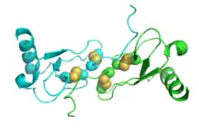 Human Mip-1β dimer. PDB 1hum.[2] Disulfide bonds highlighted.