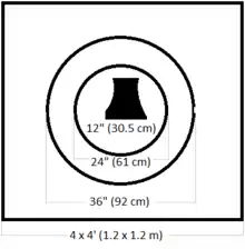 The "Second Class Figure Target" was 48 inches square (approximately 1.2 x 1.2 meters), with 24 in (61 cm) inner and 36 in (91 cm) magpie circles. The aiming mark was a 12 in × 12 in (30 cm × 30 cm) silhouette figure that represented the outline of the head of a man aiming a rifle from a trench. Points were scored by a hit anywhere on the target.
