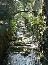 The Magaliesberg (historically also known as Macalisberg or Cashan Mountains[2]) of northern South Africa, is a modest but well-defined mountain range composed mainly of quartzites. It rises at a point south of the Pilanesberg (and the Pilanesberg National Park) to form a curved prominence that intersects suburban Pretoria before it peters out some 50 km (31 mi) to the east, just south of Bronkhorstspruit. The highest point of the Magaliesberg is reached at Nooitgedacht, about 1,852 metres (6,076 ft) above sea level. A cableway reaching to the top of the mountain range is located at Hartbeespoort Dam, providing sweeping views of the Magaliesberg and surrounding area.[3]