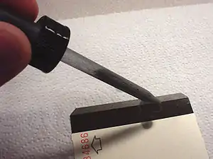 An example of damaged magnetic encoding. A magnet was run across this stripe. The encoding has been made visible by applying a Magnetic Developer solution