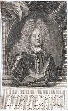 Count Magnus Stenbock (22 May 1665 – 23 February 1717) was a Swedish field marshal (Fältmarskalk) and Royal Councillor. A renowned commander of the Carolean Army during the Great Northern War, he was a prominent member of the Stenbock family. He studied at Uppsala University and joined the Swedish Army during the Nine Years' War, where he participated in the Battle of Fleurus in 1690. After the battle, he was appointed lieutenant colonel, entered Holy Roman service as Adjutant General, and married Eva Magdalena Oxenstierna, daughter of statesman Bengt Gabrielsson Oxenstierna. Returning to Swedish service he received colonelcy of a regiment in Wismar, and later became colonel of the Kalmar and then Dalarna regiments.