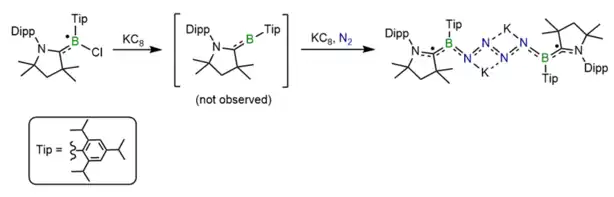 Lithium can also react with N2 at room temperature to give an isolable product Li3N.[9][10] However, it was until recently that the controllable, stepwise N2 activation by main group element began to thrive, especially for those whose key intermediates were well structurally characterized and even isolated.