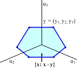 For we have if and only if is in the convex hull of all vectors obtained by permuting the coordinates of . Figure 1 displays the convex hull in 2D for the vector . Notice that the center of the convex hull, which is an interval in this case, is the vector . This is the "smallest" vector satisfying for this given vector . Figure 2 shows the convex hull in 3D. The center of the convex hull, which is a 2D polygon in this case, is the "smallest" vector satisfying for this given vector .