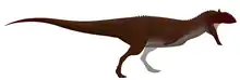 Majungasaurus was a medium-sized theropod that typically reached 5.6–7 m (18–23 ft) in length and weighed 750–1,100 kg (1,650–2,430 lb).[2][11][12][13] Fragmentary remains of larger individuals indicate that some adults could have been similar in size to its relative Carnotaurus, possibly exceeding 8 m (26 ft) in length.[13]