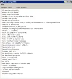 When it is invoked, one can choose the name of the Windows 3.1 application program image file using the "Choose Program" option on the "File" menu. After the program image file is chosen, Make Compatible by default displays a list of five options that can be set to alter the behaviour of Windows for that program when it is executed:[1]