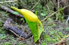 Malcolm Knapp Research Forest is categorized in the Coast Western Hemlock Biogeoclimatic zone, with the lower portion of the forest in the dry maritime subzone and the upper portion in the very wet maritime subzone. It has a vast collection of trees, plants and animals including Douglas fir, western red cedar, western hemlock and amabilis fir trees. The forest still has some patches of intact old growth forest that is over 400 years old, but since ongoing research is being done, some of the forest is as young as 40 years old, though most of the forest is covered in trees that are about 70 years old.[5] Some other trees and plants you can find are bigleaf maple, vine maple, skunk cabbage (yellow flower pictured beside), Oregon grape, salmonberry, and many ferns like sword fern and spiny wood fern.