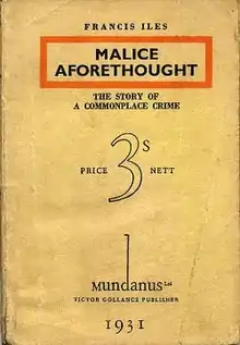 Malice Aforethought (1931) is a crime novel written by Anthony Berkeley Cox, using the pen name Francis Iles. It is an early and prominent example of the "inverted detective story", claimed to have been invented by R. Austin Freeman some years earlier. The murderer's identity is revealed in the first line of the novel, which gives the reader insight into the workings of his mind as his plans progress. It also contains elements of black comedy, and of serious treatment of underlying tensions in a superficially respectable community. It is loosely based on the real-life case of Herbert Armstrong, with elements of Doctor Crippen.