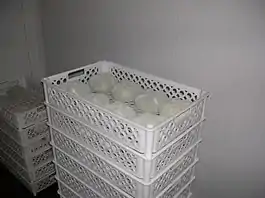 The milk is coagulated by animal rennet when the milk is 30-35°C (86-95°F) and for a period not less than 30 minutes.[2] The curd is cut mechanically with horizontal and vertical lyres until the curd is reduced to pieces of less than 20mm (inches) to facilitate drainage of the whey. The curd is then placed in moulds inside a linen or cotton lining, within the mould it is subjected to a pressure of between 2 and 6 kg/cm2. for at least 3 hours. The pressed cheeses are then salted in a brine bath for at least 18 hours. The cheeses are then allowed to mature in a room at a temperature of 10-17°C (50-63°F) at a relative humidity of up to 95%. The minimum time for curing is 20 days. From 7 days after the brine bath the cheeses are turned and the rinds rubbed with olive oil. This procedure is repeated several times assisting the maturation and causing the rind to achieve the characteristic colour and aroma.[1] The production is seasonal, since it is not made in summer. [2]