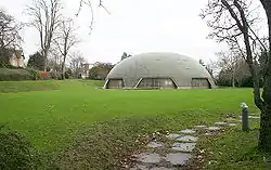 The school campus has a listed sports hall – The Edinburgh Dome, so named as it was unveiled by the Duke of Edinburgh. It consists of a round, green, balloon-shaped building, containing squash courts, a gym area and a games area, surrounded by a moat. Based on an innovative roof construction by Dante Bini, the Binishell (or Parashell), it was built in 1977 by architect Michael Godwin and consultant engineer John Faber. It was opened in 1978. On the advice of English Heritage it has been designated a Grade II listed building.[17]