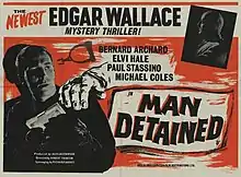 Man Detained is a 1961 British crime film directed by Robert Tronson and starring Bernard Archard, Elvi Hale and Paul Stassino. Part of the long-running series of Edgar Wallace Mysteries films made at Merton Park Studios, it is loosely based on the 1916 novel A Debt Discharged by Edgar Wallace.[1]