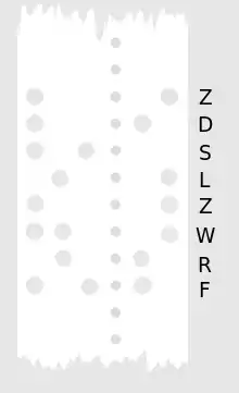 Mathematician Alan Turing, who had been appointed to the nominal post of Deputy Director of the Computing Machine Laboratory at the University of Manchester in September 1948,[10] devised a base 32 encoding scheme based on the standard ITA2 5-bit teleprinter code, which allowed programs and data to be written to and read from paper tape.[21] The ITA2 system maps each of the possible 32 binary values that can be represented in 5 bits (25) to a single character. Thus "10010" represents "D", "10001" represents "Z", and so forth. Turing changed only a few of the standard encodings; for instance, 00000 and 01000, which mean "no effect" and "linefeed" in the teleprinter code, were represented by the characters "/" and "@" respectively. Binary zero, represented by the forward slash, was the most common character in programs and data, leading to sequences written as "///////////////". One early user suggested that Turing's choice of a forward slash was a subconscious choice on his part, a representation of rain seen through a dirty window, reflecting Manchester's "famously dismal" weather.[22]