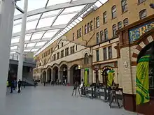 The original M&LR single-storey offices facing Hunt's Bank Approach were built in the Italianate style in sandstone ashlar with slate roofs in 1844. They were later enlarged and given a second storey. William Dawes built the station's larger extension for the L&YR in 1909. It is at right-angles to the north end of the old station giving the enlarged station an L-shaped plan. Facing Victoria Station Approach, its façade is in the Edwardian neo-Baroque style, four storeys high and 31 bays to the rounded corner at the south-east end. The ground floor windows have rounded heads and those on the floors above are square. The ornate glass and iron canopy along the façade displays the names of destinations that the station served in Art Nouveau lettering.[1] The canopy was damaged by the Provisional IRA's 1996 bomb placed in a street adjacent to the Arndale Centre and was restored four years later.[46]