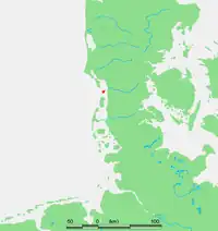Mandø is geographically one of the northernmost islands among the North Frisian Islands off the southwestern Danish and northwestern German coast.[5] The Frisian Islands are generally the line of demarcation separating the North Sea from the Wadden Sea, which is a shallow sea of approximately 5000 square kilometers in size, riddled with small islands and tidal flats. The entire Wadden Sea area was formed by intervening riverine depositional periods between Ice Age glacier movements.