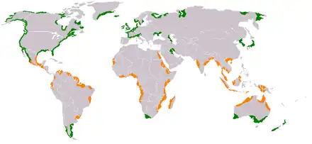 Mangroves can be found in 118 countries and territories in the tropical and subtropical regions of the world.[22] The largest percentage of mangroves is found between the 5° N and 5° S latitudes. Approximately 75% of world's mangroves are found in just 15 countries.[22] Estimates of mangrove area based on remote sensing and global data tend to be lower than estimates based on literature and surveys for comparable periods.[10]