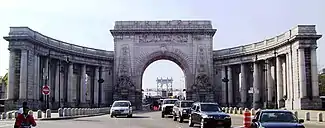 In 1910, the year after the bridge opened, Carrère and Hastings drew up preliminary plans for an elaborate Beaux Arts grand entry to the bridge on the Manhattan side as part of the "City Beautiful" movement (see § Arch and colonnade), as well as a smaller approach on the Brooklyn side. These approaches would hide the bridge.[42] The final plans were approved in 1912,[43] and construction began the same year. A plot of 400 by 750 feet (120 by 230 m), bounded by the Bowery and Canal, Forsyth, and Bayard Streets was cleared for the arch and colonnade's construction.[44][45] The arch and colonnade were completed in 1915,[46] while a pair of pylons on the Brooklyn side were installed in November 1916.[42][47]