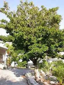 Sapodilla can grow to more than 30 m (98 ft) tall with a trunk diameter of up to 1.5 m (5 ft). The average height of cultivated specimens, however, is usually between 9 and 15 m (30 and 49 ft) with a trunk diameter not exceeding 50 cm (20 in).[6] It is wind-resistant and the bark is rich in a white, gummy latex called chicle. The ornamental leaves are medium green and glossy. They are alternate, elliptic to ovate, 7–15 cm (3–6 in) long, with an entire margin. The white flowers are inconspicuous and bell-like, with a six-lobed corolla. An unripe fruit has a firm outer skin and when picked, releases white chicle from its stem. A fully ripened fruit has saggy skin and does not release chicle when picked.