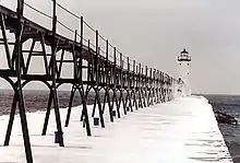 The current tower is located on the north pier. It is constructed of cast iron, and was first listed in 1927. The tower is a white cylinder, and the keepers house is separate. The original lens was a Fifth Order Fresnel lens.[6] The tower has also been rebuilt as the pier has been extended. Other changes have involved the placement and configuration of the fog horn.[2] The present tower is 39 feet (12 m) tall. The catwalk is one of only four that survive in the State of Michigan.[7] National Register of Historic Places, Reference # 90000718 The tower is capped with a ten-sided steel lantern. The light uses a 5,000 candlepower incandescent electric bulb, and has a flashing mechanism which displays "a group occulting white light" over 30 seconds. Its focal plane is 55 feet (17 m), and is visible for 12 nautical miles (22 km; 14 mi) in clear weather. The "Type C" diaphone is powered by an electric compressor housed in the tower, and emits a group of three blasts every 30 seconds.[2] There is also a radio beacon.[8]