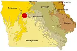 ![]() Manson impact location shown in red on bedrock map of Iowa | |