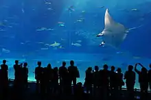 The Okinawa Ocean Expo Aquarium acquired mantas in 1981 which survived for four days.[57] In addition, at the Okinawa Churaumi Aquarium, a male manta ray, which started captivity in 1992 at its predecessor, the Okinawa Ocean Expo Aquarium, was recorded to have lived for approximately 23 years.[58] The Okinawa Churaumi Aquarium houses manta rays in the "Kuroshio Sea" tank, one of the largest aquarium tanks in the world. The first manta ray birth in captivity took place there in 2007. Although this pup did not survive, the aquarium has since had the birth of four more manta rays in 2008, 2009, 2010 and 2011.[36][59] However, although Manta became pregnant in 2012, she was stillborn.[60] In 2013, she became pregnant, but her mother, manta ray, died and the pup that was taken out died.[61]