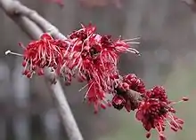 Maple species, such as Acer rubrum, may be monoecious, dioecious or polygamodioecious. The flowers are regular, pentamerous, and borne in racemes, corymbs, or umbels. They have four or five sepals, four or five petals about 1–6 mm long (absent in some species), four to ten stamens about 6–10 mm long, and two pistils or a pistil with two styles. The ovary is superior and has two carpels, whose wings elongate the flowers, making it easy to tell which flowers are female. Maples flower in late winter or early spring, in most species with or just after the appearance of the leaves, but in some before the trees leaf out.[7]