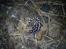 The first months that Marbled Salamanders spend living out of the water are the most important in determining how many will survive until the next breeding season.[6] Marbled Salamanders are not strong burrowers, therefore they rely on existing holes in the ground for shelter.[6] Desiccation, heat stress, soil moisture, temperature, and pH are all important factors in determining if a Marbled Salamander will survive.[6] Chances of survival are low for Marbled Salamanders who travel through fields, however, they have been observed to traverse fields in order to find other pond areas.[6] Marbled Salamanders survive best in a forest habitat, compared to an open field.[7][6] Protecting wetlands is key to the survival of this species.[7] Conservationists recommend leaving a buffer zone of forest around wetlands to increase survivorship of Marbled Salamanders.[6] Male marbled salamanders have also been shown to have a higher survivorship than females.[8] Marbled Salamanders in the northern portions of their range can also go into a state of torpor to survive the cold months. [9]
