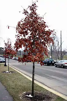 Marcescence is the withering and persistence of plant organs that normally are shed, and is a term most commonly applied to plant leaves.[1][2] The underlying physiological mechanism is that trees transfer water and sap from the roots to the leaves through their vascular cells, but in some trees as autumn begins, the veins carrying the sap slowly close until a layer of cells called the abscission layer completely closes off the vein allowing the tree to rid itself of the leaf.[3] Leaf marcescence is most often seen on juvenile plants and may disappear as the tree matures. It also may not affect the entire tree; sometimes leaves persist only on scattered branches.[4] Marcescence is most obvious in deciduous trees that retain leaves through the winter. Trees that exhibit marcescence are known as "everciduous". Several trees normally have marcescent leaves such as oak (Quercus),[5] beech (Fagus) and hornbeam (Carpinus), or marcescent stipules as in some but not all species of willows (Salix).[6] All oak trees may display foliage marcescence, even species that are known to fully drop leaves when the tree is mature.[7] Marcescent leaves of pin oak (Quercus palustris) complete development of their abscission layer in the spring.[8] The base of the petiole remains alive over the winter. Many other trees may have marcescent leaves in seasons where an early freeze kills the leaves before the abscission layer develops or completes development. Diseases or pests can also kill leaves before they can develop an abscission layer.
