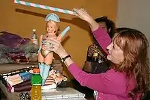 Her work has evolved towards performance, often using herself to depict the main female figure(s).[4] She learned about performance art through books and was impressed by the idea of experimenting with time and space as well as with an audience directly.[3] For Chellet, doing performance is a way to get beyond her own boundaries, confronting her limits and those of others to express her doubts and worries.[4] She believes that performance art is partly therapeutic and healing in a ritual sense.[3] She has represented herself as the Mona Lisa, Venus de Milo, as the wife of Arnolfini, Joan of Arc, Cinderella and several versions of the Virgin Mary, as well as a nurse, a neglected housewife, a nun, as a femme fatale, prostitute and more.[2][6][7] Chellet has performed in various venues from the street to Chapultepec Park, to museums such as ex Teresa el Actual and the Museo del Chopo and in avant guarde galleries.[3]