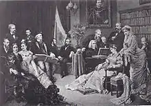 From left to right: Hermann von Helmholtz, Heinrich von Angeli, von Schleinitz, Anna von Helmholtz, count Götz von Seckendorff, countess Hedwig von Brühl, crown princess Victoria, count Wilhelm Pourtalès, crown prince Friedrich, Alexander von Schleinitz, Anton von Werner, prince Hermann of Hohenlohe-Langenburg.