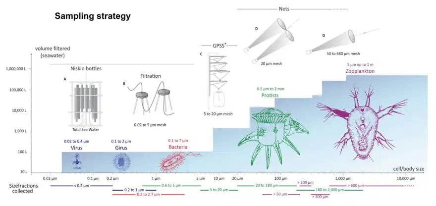 Modified text was copied from this source, which is available under a Creative Commons Attribution 4.0 International License. - Karsenti, E.; Acinas, S.G.; Bork, P.; Bowler, C.; De Vargas, C.; Raes, J.; Sullivan, M.; Arendt, D.; Benzoni, F.; Claverie, J.M.; Follows, M. (2011). "A holistic approach to marine eco-systems biology". PLOS Biology. 9 (10): e1001177. doi:10.1371/journal.pbio.1001177. PMC 3196472. PMID 22028628.