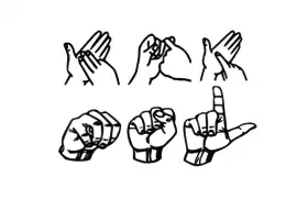 Top: "MSL" in two-handed BANZSL fingerspelling