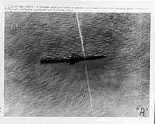 To avoid "shaking hands with St. Peter" (as Lockwood put it),[27] E.A. Johnson, USNR, supervised by Taylor, dropped dummy warheads filled with sand from a crane raised to a height of 90 feet (27 m). In 7 out of 10 of these trials, firing mechanisms bent, jammed, and failed with the high inertia of a straight-on hit (the prewar ideal).[28] A quick fix was to encourage "glancing" shots[29] (which cut the number of duds in half),[28] until a permanent solution could be found. Lightweight aluminum alloy (from propellers[28] of Japanese planes shot down during the attack on Pearl Harbor) was machined to take the place of the Mark 6's heavy pin block so inertial forces would be lower. Electrical switches, developed by Johnson,[28] were tried as well. Both fixes worked and were relatively easy to implement. In September 1943, the first torpedoes with new contact pistols were sent to war.[30] "After twenty-one months of war, the three major defects of the Mark 14 torpedo had at last been isolated. ... Each defect had been discovered and fixed in the field—always over the stubborn opposition of the Bureau of Ordnance."[29]