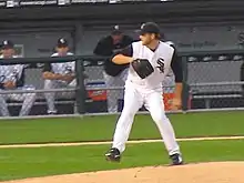 In 2005, Buehrle began the season with a 10–3 record, a 2.58 ERA and a 1.11 WHIP. On April 16, he finished a game against the Seattle Mariners in only 1 hour and 39 minutes, giving up only one run and three hits (all to Ichiro Suzuki), and backed by only two White Sox runs, both homers by Paul Konerko. In the game, he threw just 106 pitches. Subtracting the time spent between innings, the game took only 63+1⁄2 minutes to play.[13] Buehrle was selected to the American League All-Star Team, and was named the starting pitcher after Roy Halladay could not to play due to a broken leg.[14] He pitched two innings, allowing no runs and striking out three batters while earning a win.[15] Buehrle's streak of 49 consecutive starts of six or more innings ended on August 1, 2005, after he was ejected for hitting Baltimore Orioles outfielder B. J. Surhoff.[16] During the White Sox playoff run, Buehrle pitched a complete game against the Los Angeles Angels of Anaheim in Game 2 of the ALCS,[17] the first of four consecutive complete games for White Sox starters.[18] On October 25, 2005, Buehrle became the first pitcher in World Series history to start and save consecutive games, earning a no-decision in Game 2 and his first career save in Game 3 of the 2005 World Series, which the Sox swept from the Houston Astros, winning their first world championship since 1917.[19]