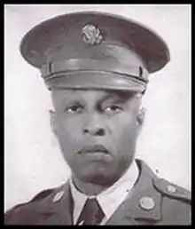 He was also a member of the Buffalo Soldiers' drum and bugle corps, and performed at funerals in Arlington National Cemetery, where he himself would later be buried. Since the Army would not allow colored soldiers to be seen at white funerals at this time, he was forced to hide in the woods while playing "Taps".[4] A decade later, he fought in World War II and saw combat action at the Battle of Saipan in the South Pacific.[1] During the conflict, he rose to the rank of First Sergeant.[5] He had originally been sent to train with the Tuskegee Airmen, but was deemed to be too old at the time.[4]