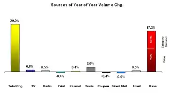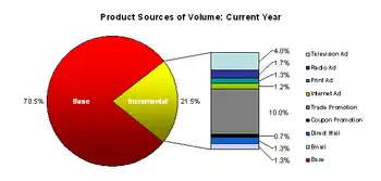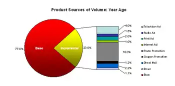 Incremental sales: Incremental sales are the component of sales driven by marketing and promotional activities. This component can be further decomposed into sales due to each marketing component like television advertising or radio advertising, print advertising (magazines, newspapers etc.), coupons, direct mail, Internet, feature or display promotions and temporary price reductions. Some of these activities have short-term returns (coupons, promotions), while others have longer term returns (TV, radio, magazine/print).