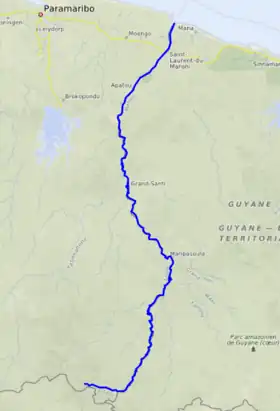 The Maroni runs through the Guianan moist forests ecoregion.[1] It originates in the Tumuk Humak Mountains and forms the (disputed) border between France (region of French Guiana) and Suriname. In its upper reaches, it is also known as the Lawa, and close to its source it is known as the Litani. The total length of Litani, Lawa and Maroni is 612 km (380 mi).[2]