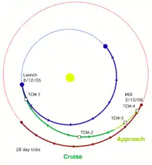 MRO cruised through interplanetary space for seven and a half months before reaching Mars. While en route, most of the scientific instruments and experiments were tested and calibrated. To ensure proper orbital insertion upon reaching Mars, four trajectory correction maneuvers were planned and a fifth emergency maneuver was discussed.[11] However, only three trajectory correction maneuvers were necessary, which saved 60 pounds (27 kg) of fuel that would be usable during MRO's extended mission.[12]
