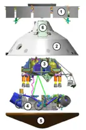 Diagram of the MSL spacecraft: 1- Cruise stage; 2- Backshell; 3- Descent stage; 4- Curiosity rover; 5- Heat shield; 6- Parachute
